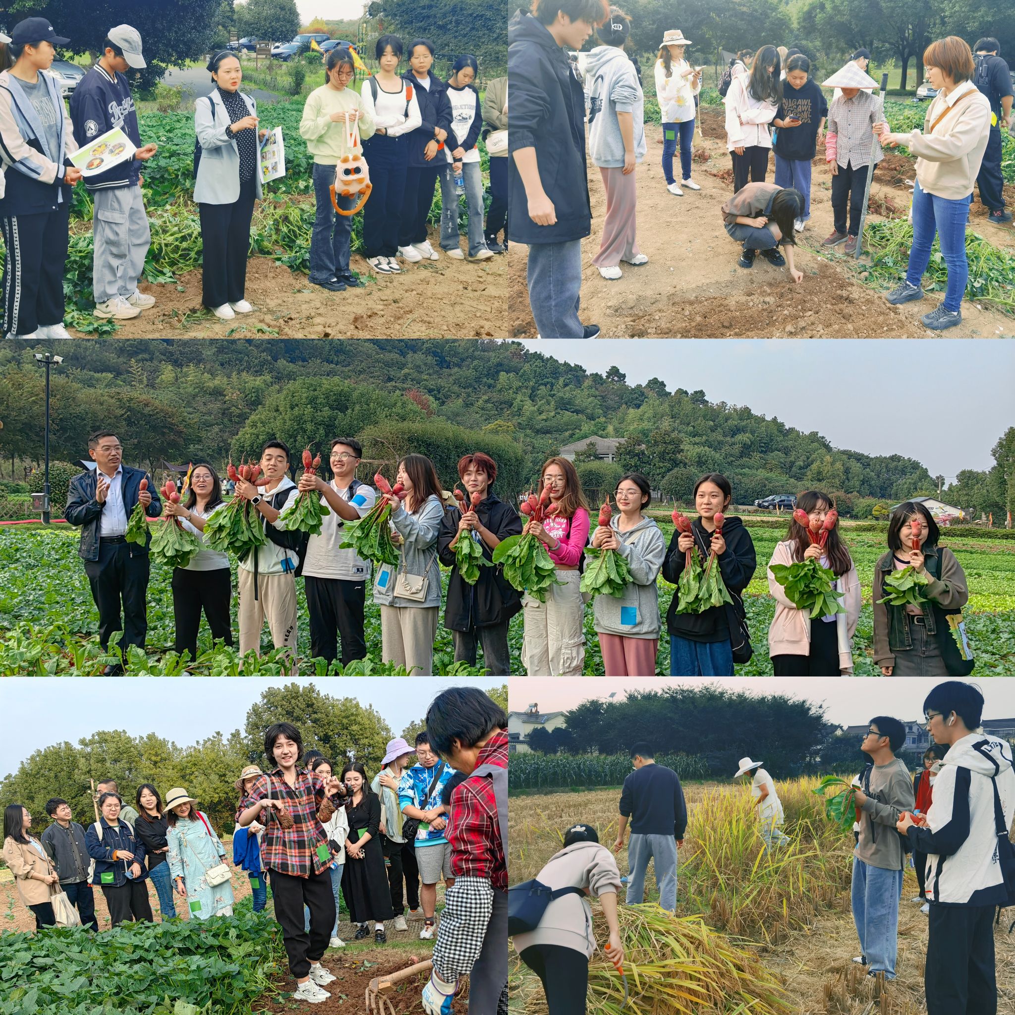 党委副书记冯绪猛、科技史系主任沈志忠教授、旅游系主任崔峰教授、动医学院杭苏琴教授、七斗半人文空间主理人朱琳琳等老师受邀出席。园艺学院柳李旺教授、蒋芳玲教授、王燕副教授、周蓉副教授、虞夏清副教授等老师受聘研学导师兼农园技术顾问。近80位来自文化遗产、旅游管理和表演、生科等专业的研究生、本科生一起参与体验丰收盛会。