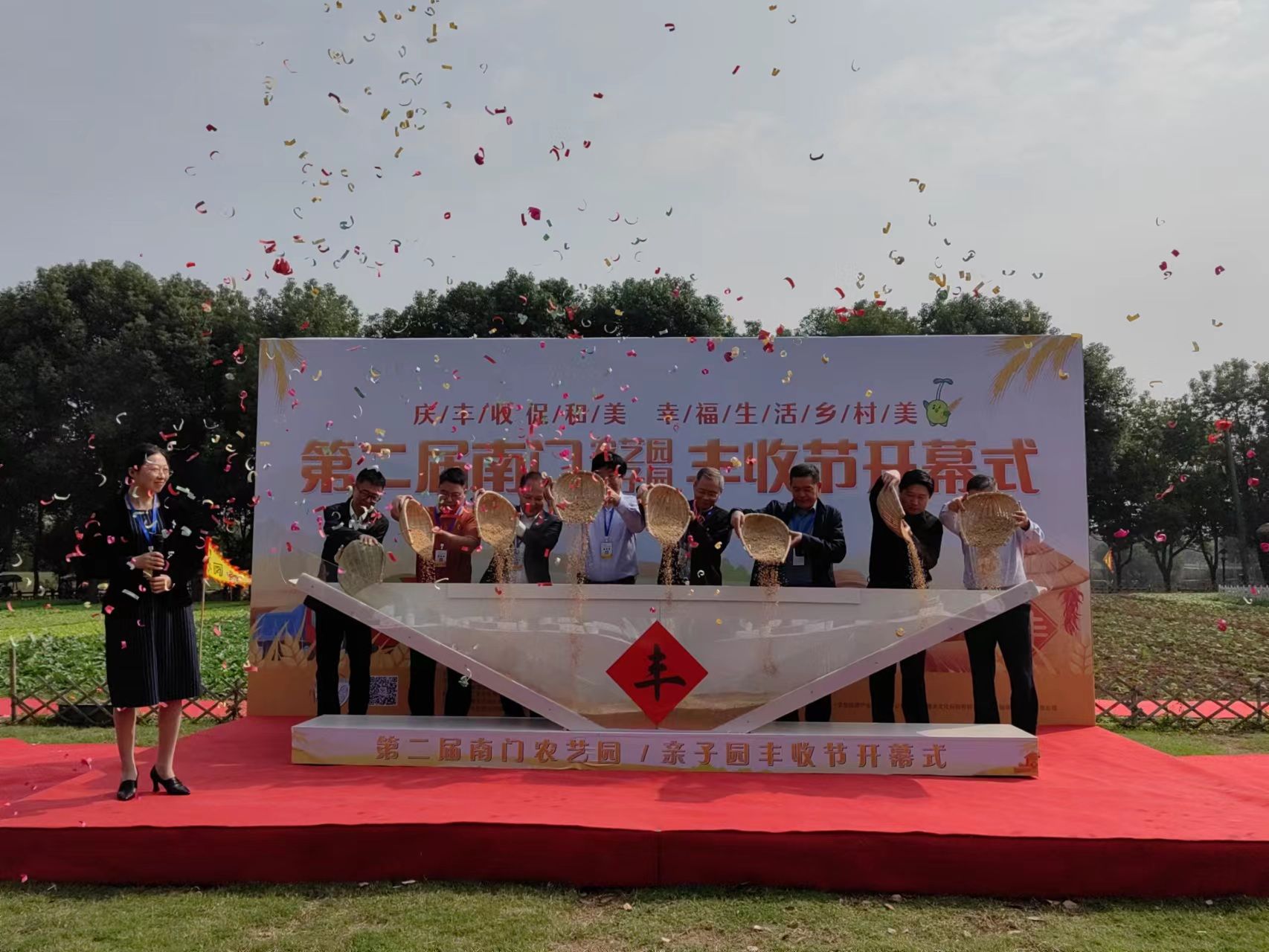 党委副书记冯绪猛、江苏省公共协会副会长郭明全、江苏省公共关系协会常务副会长冯杰、江苏省公共关系协会乡村振兴工作委员会主任牛宜生、南京梅山生活服务发展有限公司总经理殷正标和党委书记张世勇共同启动丰收节活动。