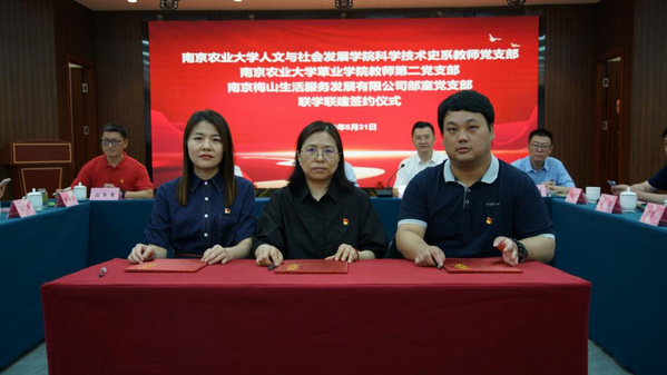 科学技术史系党支部书记吴昊、草业学院教师第二党支部书记张风革,与南京梅山生活服务发展有限公司综合管理部总经理、部室党支部书记张学芳,共同签署了党支部联学联建协议。会上,吴昊和张风革分别领读习近平总书记2023年5月29日在二十届中央政治局第五次集体学习上的讲话,以及《习近平关于“三农”工作的重要论述学习读本》部分章节的内容,与会者围绕学科特色和研究基础、专业交叉融合发展方向、学科发展方向、人才培养模式、未来工作设想等多个方面发言交流。科学技术史系主任沈志忠带领大家参观南门农艺园博物馆,并讲解中华农业历史。