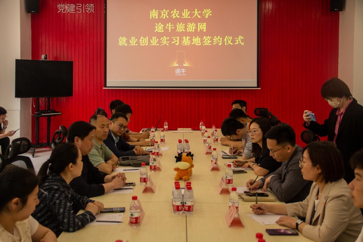 途牛旅游网金融及公共事务负责人董全权、人力资源中心大政委曹玉斌、度假部产品负责人乔成伟、人力资源中心人事总监刘玲、人力资源中心HRBP王龙华等领导出席校企座谈会。冯绪猛与董全权共同签署91视频