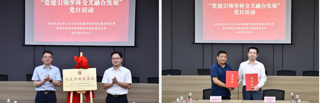 农村发展系教师党支部和高淳区漆桥街道双游村党总支共建签约仪式,吴群与胡学艺共同为党支部共建基地揭牌,双方党支部书记签署了共建协议。