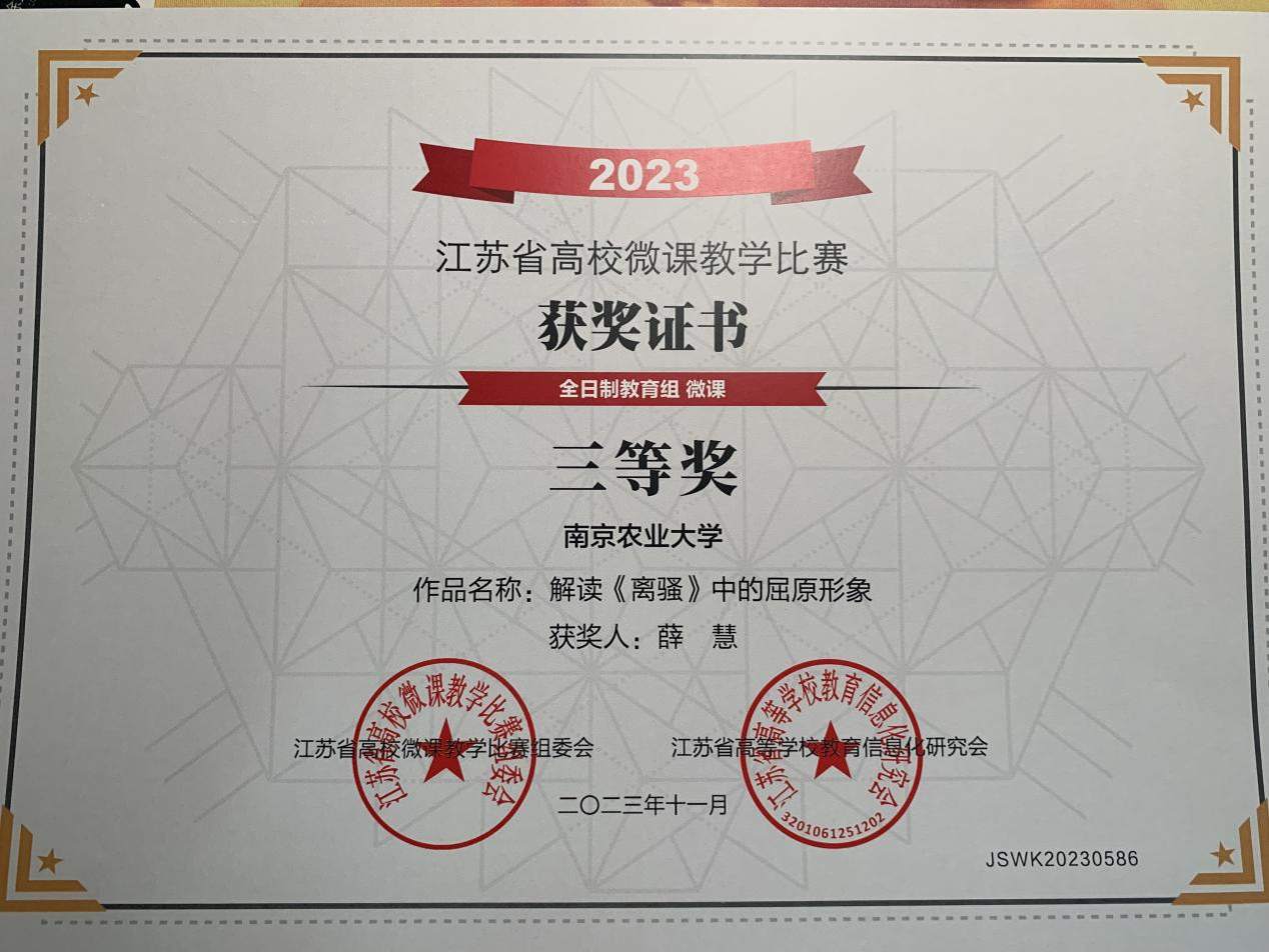 近日,江苏省高等学校教育信息化研究会公布了2023年江苏省高等学校微课教学比赛获奖名单,91视频 艺术系薛慧老师的参赛作品:《解读<离骚>中的屈原形象》获得江苏省三等奖荣誉。