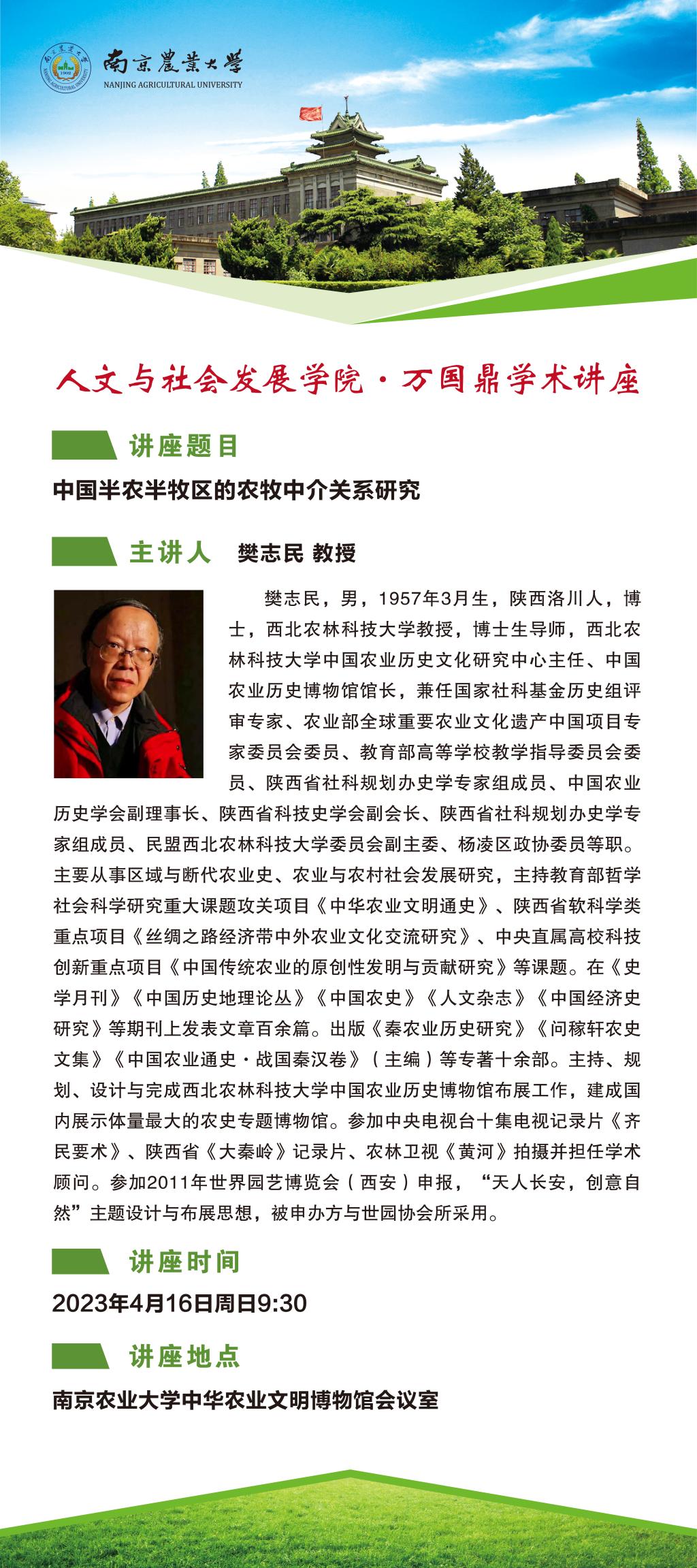 樊志民,男,1957年3月生,陕西洛川人,博士,西北农林科技大学教授,博士生导师,西北农林科技大学中国农业历史文化研究中心主任、中国农业历史博物馆馆长,兼任国家社科基金历史组评审专家、农业部全球重要农业文化遗产中国项目专家委员会委员、教育部高等学校教学指导委员会委员、陕西省社科规划办史学专家组成员、中国农业历史学会副理事长、陕西省科技史学会副会长、陕西省社科规划办史学专家组成员、民盟西北农林科技大学委员会副主委、杨凌区政协委员等职。主要从事区域与断代农业史、农业与农村社会发展研究,主持教育部哲学社会科学研究重大课题攻关项目《中华农业文明通史》、陕西省软科学类重点项目《丝绸之路经济带中外农业文化交流研究》、中央直属高校科技创新重点项目《中国传统农业的原创性发明与贡献研究》等课题。在《史学月刊》《中国历史地理论丛》《中国农史》《人文杂志》《中国经济史研究》等期刊上发表文章百余篇。出版《秦农业历史研究》《问稼轩农史文集》《中国农业通史·战国秦汉卷》(主编)等专著十余部。主持、规划、设计与完成西北农林科技大学中国农业历史博物馆布展工作,建成国内展示体量最大的农史专题博物馆。参加中央电视台十集电视记录片《齐民要术》、陕西省《大秦岭》记录片、农林卫视《黄河》拍摄并担任学术顾问。参加2011年世界园艺博览会(西安)申报,“天人长安,创意自然”主题设计与布展思想,被申办方与世园协会所采用。
