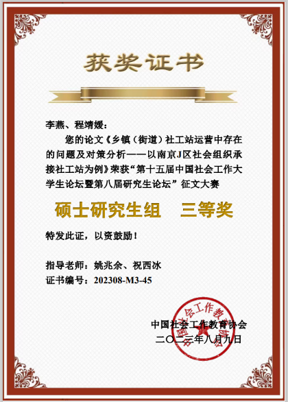 2022级社会工作研究生李燕、程靖媛撰写的论文《乡镇(街道)社工站运营中存在的问题及对策分析——以南京J区社会组织承接社工站为例》荣获研究生组三等奖。